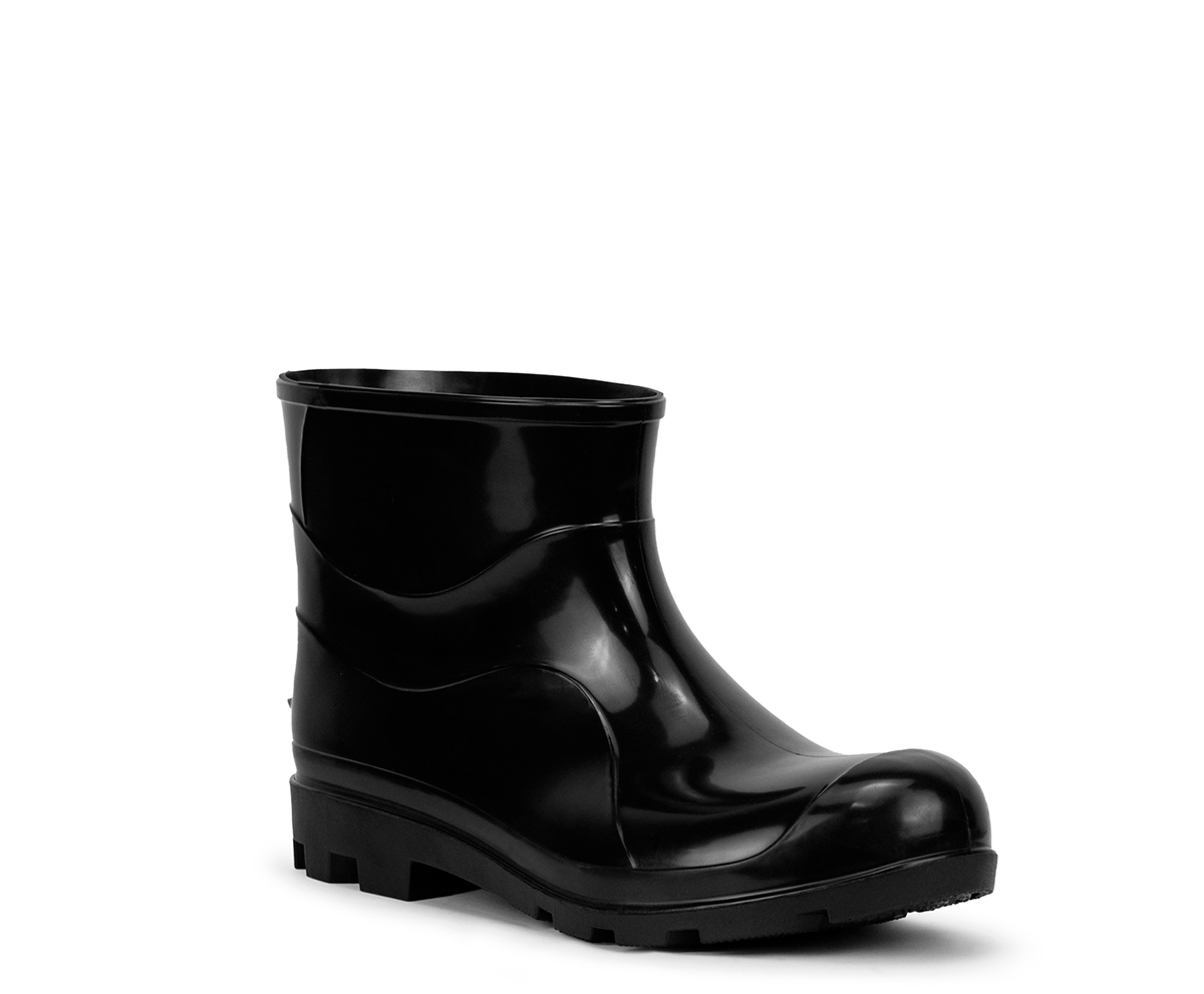 Calçado ocupacional tipo bota abaixo do joelho, constituída de policloreto de vinila (PVC), desenho do cabedal tipo (C), montagem sistema de injeção por extrusão, classificação (II – Inteiro polimérico) solado monodensidade com ressaltos, solado resistente à ação de óleo combustível. Região do salto totalmente fechada, com resistência ao escorregamento.